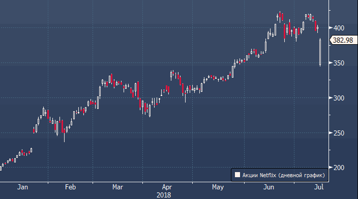 Акции Netflix во вторник рухнули более чем на 13% и оказались у отметки в $344 за штуку. Столь бурная реакция инвесторов стала следствием расхождения фактического прироста базы подписчиков и прогноза компании на 1 млн человек, а также снижения прогноза по росту абонентов на третий квартал, о которых стало известно после закрытия торгов в понедельник.
