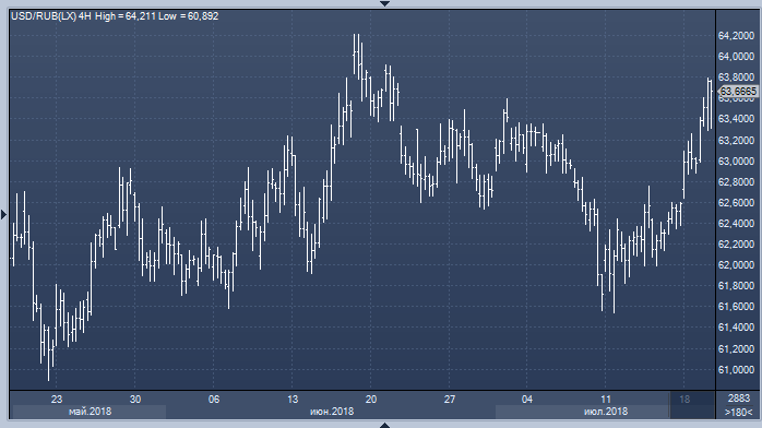 По итогам торгов в четверг 19 июля курс доллара к рублю вырос на 69 копеек до 63.67, а курс евро к рублю - на 80 копеек до 74.07 (прим. ProFinance.ru: по состоянию на 23:50 МСК).