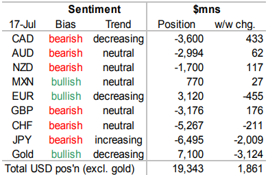 Как следует из последних данных CFTC, за неделю до 17 июля изменения в спекулятивном валютном позиционировании претерпели незначительные изменения, что не помешало объему чистого лонга по доллару достичь свежего 16-месячного максимума в $19.3 млрд. Основную лепту в это событие внесло увеличение чистой короткой позиции по иене сразу на $2 млрд. Все основные валюты, кроме евро и мексиканского доллара, проданы против американской (наиболее агрессивно — такие традиционные убежища, как иена и франк).
