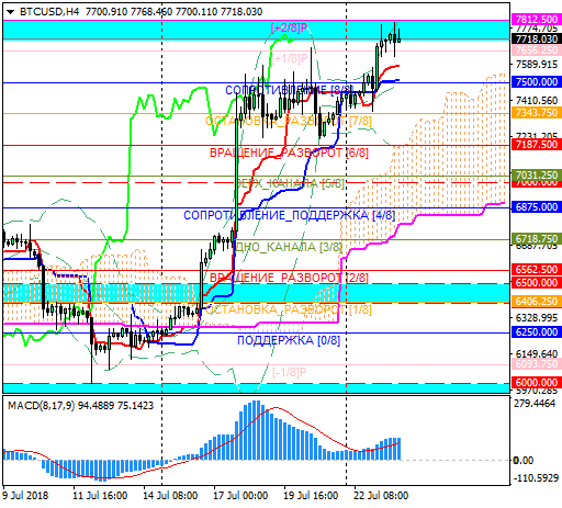 Если пробить зону сопротивления 7700-7800 не удастся, коррекционный вариант может отправить биткоин к уровням 7500, 7350, 7200 и 7030.