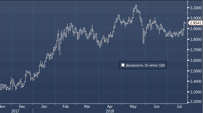 «Вчера доходность американских «десятилеток» взлетела до месячного максимума в 2.9652%», - пишут аналитики банка. - «Похоже, что непосредственным поводом к тому послужил похожий рост доходности японских бумаг, однако свою роль сыграли и опасения негативного влияния торговых войн на макроэкономику. Пока, несмотря на угрозы, исходящие от президента США, деловое доверие оставалось высоким, однако когда-нибудь эти риски могут его ухудшить, что приведет к падению инвестиций.