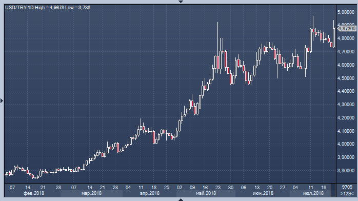 Центральный банк Турции вопреки ожиданиям рынка сохранил процентные ставки без изменений в своем первом решении о денежно-кредитной политике после выборов президента страны, поскольку вновь избранный президент Реджеп Тайип Эрдоган назначил своего зятя «новым экономическим царем страны». Акции и лира обрушились. Банк удержал недельную ставку репо на уровне 17.75%, на целый процент ниже, чем гласила медианная оценка аналитиков в опросе Bloomberg. Лира упала на 4.2% до 4.9384 доллара.