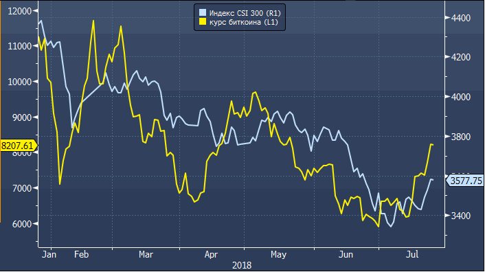 Последние 6 месяцев биткоин задает тон китайским акциям с опережением в 6 дней. Судя по недавней динамике этой криптовалюты, фондовый рынок Поднебесной ждет дальнейший рост. Спекулятивная и волатильная природа биткоина означает, что ключевым фактором, влияющим на его цену, могут быть изменения в объемах ликвидности. С учетом этого, можно утверждать, что достижение биткоином дна в конце июня был первым признаком того, что тренд на снижение долговой нагрузки в Китае завершен, и начался новый этап смягчения политики. Хотя такая связь может в конечном итоге оказаться иллюзорной, оба рынка высоковолатильны и зависят от ликвидности.