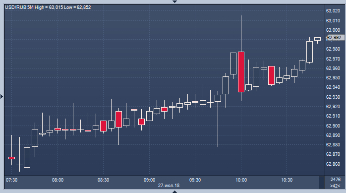 Внимание игроков сегодня также будет направлено на данные по ВВП США за 2к18: рынок надеется на сильные цифры (+4.3% г/г). Доходности 2-летних казначейских обязательств США вчера повысились на 2 бп (до 2,69%), в то время как 10-летние UST завершили день практических без изменений (2.98%). Рост доходности толкает вверх курс доллара, а это толкает рисковые активы вниз. То есть в случае выхода сильных данных рубль также рискует потерять в стоимости. То есть чаша весов сегодня склоняется не в пользу рубля.