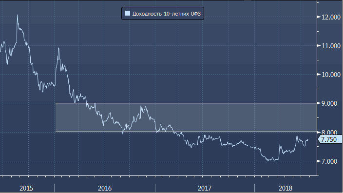 Чтобы их реализовать, вероятно, придется смириться с тем, что занимать придется по более высоким ставкам. Согласно результатам опроса аналитиков агентством Bloomberg, доходность 10-летних облигаций федерального займа (ОФЗ) должна вырасти до 8%. Последний раз такой уровень доходности можно было наблюдать более года назад. При этом около 30% опрошенных считают, что для выполнения планов потребуется более существенный рост ставок — до 9%.