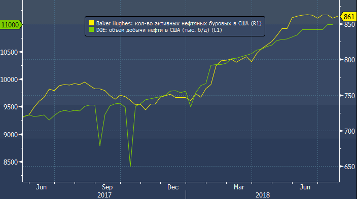 Увеличение количества нефтяных буровых выглядит логичным на фоне падения запасов черного золота в США до минимальных значений с февраля 2015 года (ProFinance.ru: в среду Минэнерго США сообщило о том, что за неделю до 20 июля запасы сократились на 6.15 млн). По данным этого ведомства, объем добычи нефти в США достиг рекордных 11 млн б/д.