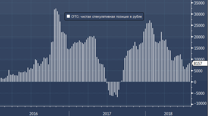 Как следует из последних данных американской Комиссии по торговле товарными фьючерсами (CFTC), за неделю до 24 июля объем чистой длинной спекулятивной позиции во фьючерсах на рубль вырос на 553 контракта (+7.3%) до 8 157 контрактов. Таким образом, спекулянты находятся в чистом лонге по российской валюте уже 46 недель подряд, а до этого занимали чистую короткую позицию 10 недель подряд. С начала года курс доллара к рублю вырос на 8.7%.