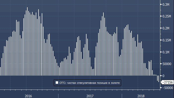 Согласно последним данным американской Комиссии по торговле товарными фьючерсами (CFTC), за неделю до 24 июля спекулянты увеличили объем чистой короткой позиции во фьючерсах и опционах на золото на 5 001 контракт до 27 156 контрактов (рекордное значение за всю историю ведения статистики с 2006 года).