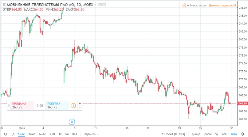 МТС не смог закрепиться выше дневных ЕМА, подтвердив приоритет шорта. Зарисовалась фигура продолжения с целью 257. При закреплении выше 266 - отмена шорта.
