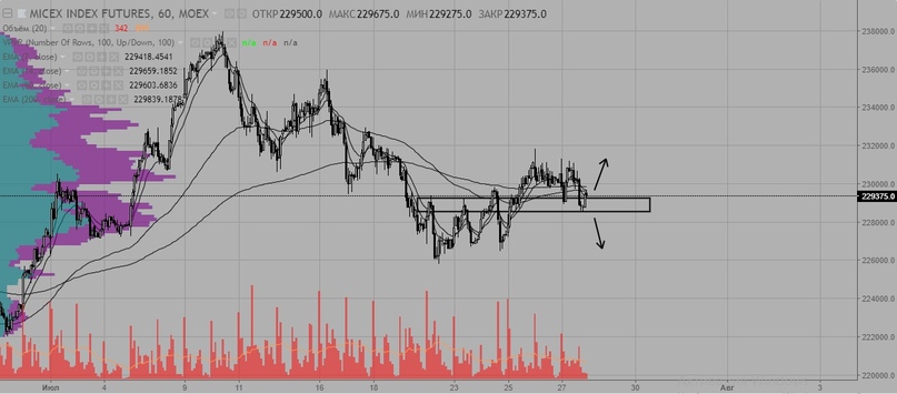 Глобально по индексу без изменений: большая лонговая фигура. Возможно нащупали 4 точку, но риск более глубокого снижения все еще велик. Локально в индексе зарисовалась часовая фигура продолжения с целью 2320. Фьючерс индекса показывает силу продавца, цена остановилась на локальном уровне приоритета, нужно наблюдать, куда расторгуют и торговать в направлении тренда.