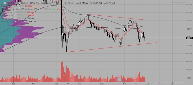 Сбер не смог преодолеть дневные ЕМА, подтвердив слабость покупателя. Сейчас возможна зарисовка фигуры продолжения под дневными ЕМА, при таком сценарии возможен слив до 160.