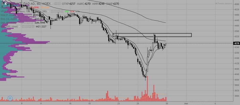 Магнит показал агрессию покупателя, но бумага все еще в шортовом приоритете. Уровень смены приоритета - 4360. Закрепление выше этого уровня совпадет с пробитием дневных ЕМА, что даст сигнал о смене тренда на растущий.
