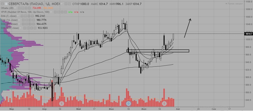Северсталь удержалась выше уровня разворотной фигуры. Первая цель 1040 и закрытие гэпа.