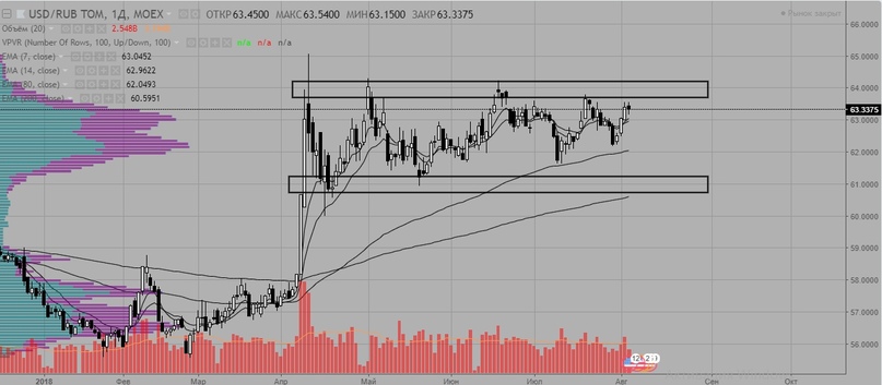 Доллар/рубль без изменений, торгуется в широком диапазоне. На второй картинке видим возможность зарисовки фигуры продолжения и пробития диапазона вверх с первой целью 65. В противном случае есть шанс получить очередную волну вниз.