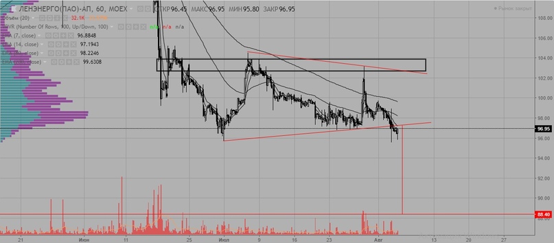Ленэнерго топчется на глобальном лонговом приоритете. Локально приоритет шорт, пока бумага ниже 104 - покупать нельзя. Цель по шортовой фигуре - 88.4