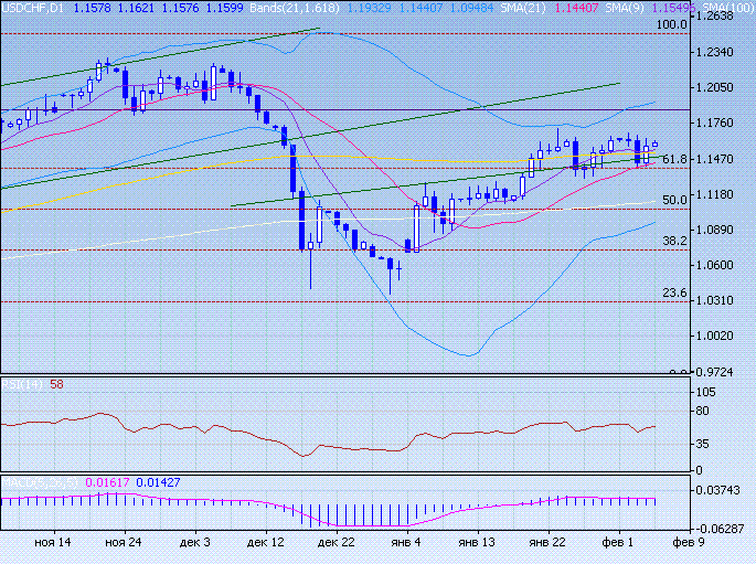 Доллар вырос, в очередной раз тестировал сопротивление в районе 1,1650. Плотное сопротивление пара сформировала на 1,1620. Прорыв сопротивлений будет сопровождаться ростом доллара под горизонтальное сопротивление на 1,1875. Снизу пара ограничена областью поддержек 1,1550-1,1395. На поведение пары может повлиять выступление вице-президента Швейцарского национального банка Филиппа Хильдебранда.