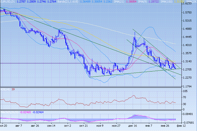В текущую сессию ожидаем снижения евро. Цель: 1,2740, после прорыв 1,2520