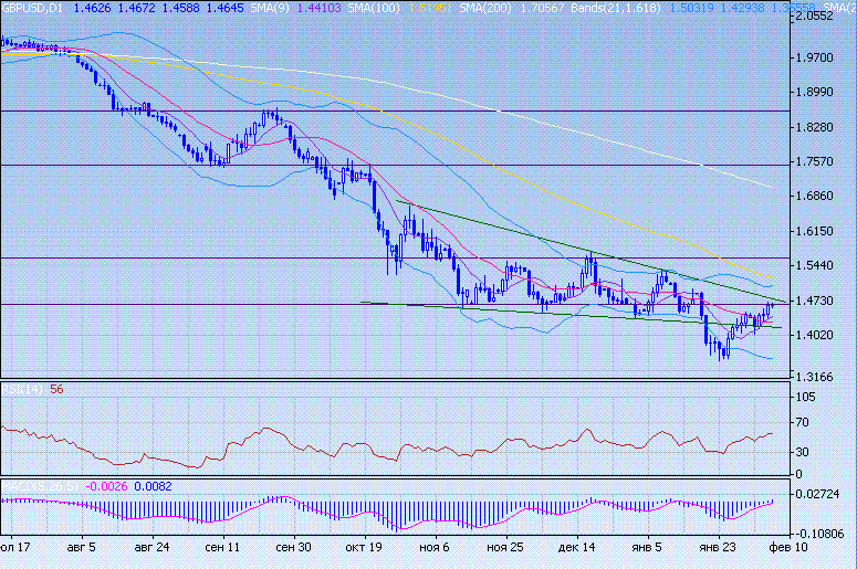 Стерлинг вырос под горизонтальное сопротивление на 1,4650. Несколько выше (1,4765) проходит среднесрочное понижательное сопротивление. Стерлингу необходим мощный импульс для прорыва сопротивлений. В случае преодоления стерлинг вырастет под верхнюю границу полосы Боллинжера. Пересечение 9МА и 21 МА поддержит стерлинг. Поддержкой теперь выступает уровень 1,4480.