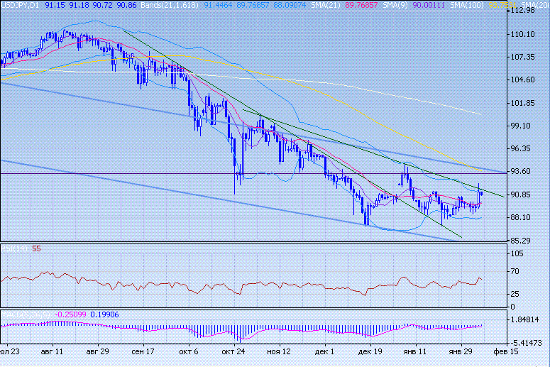 Доллар вырос под сопротивление – верхнюю границу полосы Боллинжера и среднесрочное понижательное сопротивление, проходящие в районе 91,50. Наблюдаем пересечение скользящих средних в сторону роста доллара. Вероятен откат от сопротивлений после чего последует тестирование этих сопротивлений с большой вероятностью прорыва наверх.