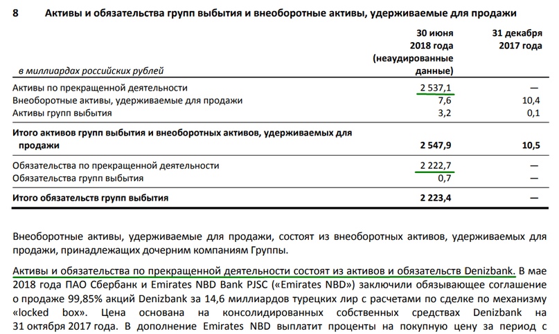 Активы и обязательства по прекращенной деятельности состоят из активов и обязательств Denizbank. В мае 2018 года ПАО Сбербанк и Emirates NBD Bank PJSC («Emirates NBD») заключили обязывающее соглашение о продаже 99,85% акций Denizbank за 14,6 миллиардов турецких лир с расчетами по сделке по механизму «locked box». Цена основана на консолидированных собственных средствах Denizbank на 31 октября 2017 года. В дополнение Emirates NBD выплатит проценты на покупную цену за период с 31 октября 2017 и по дату закрытия сделки. Расчеты по сделке будут произведены в долларах США, и договор включает элемент хеджирования, предусматривающий определение курса конверсии TRY/US Dollar внутри узкого диапазона. Таким образом влияние изменений курса конверсии TRY/US Dollar на сумму к получению, несущественное. Как часть сделки Emirates NBD приобретет у Сбербанка по номинальной стоимости права требования по субординированным кредитам Denizbank, ранее предоставленным Сбербанком. После закрытия сделки Сбербанк перестанет быть акционером Denizbank. Закрытие сделки должно быть одобрено регулирующими органами Турции, России, Объединенных Арабских Эмиратов и других государств, в которых работает Denizbank. Ожидается, что сделка будет закрыта в 2018 году.