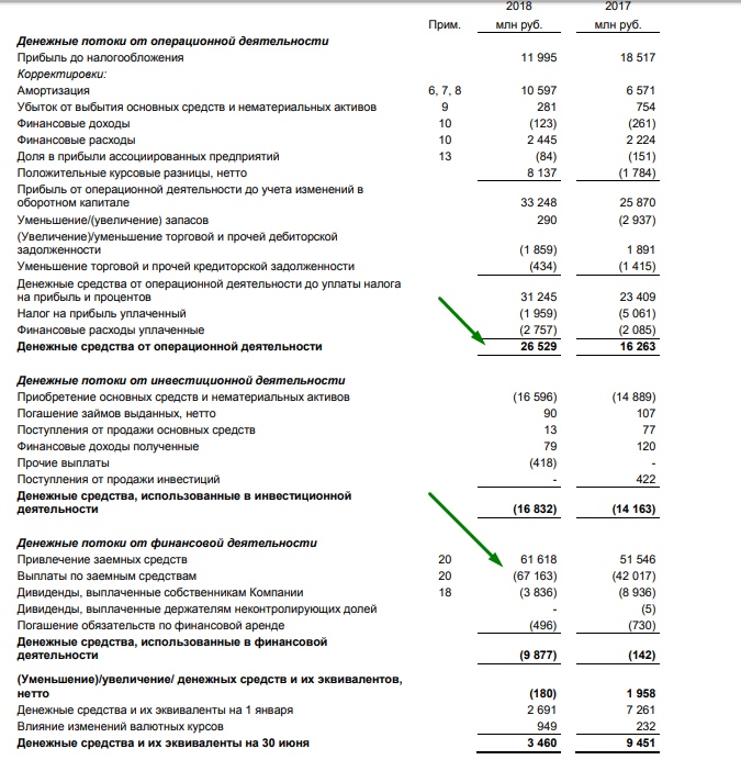 Денежный поток от операционной деятельности позволил выполнить инвестпрограмму и даже погасить часть долга (до этого его наращивали, закрывая разрывы ликвидности).