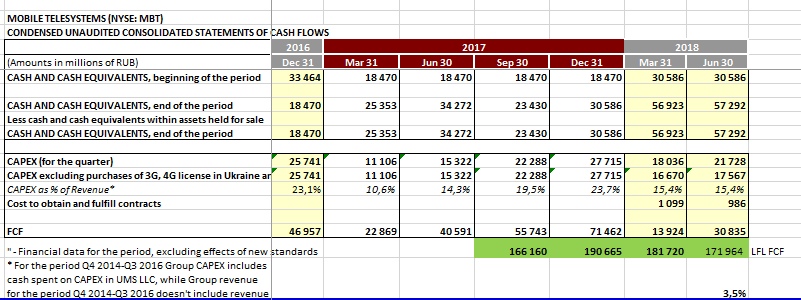 МТС удерживает свободный денежный поток на примерно одном уровне с 2017 года, прирост за 12 мес составил +3.5%.