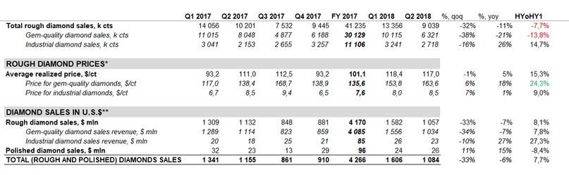 Москва, 24 августа 2018 г. – АЛРОСА, мировой лидер по объемам добычи алмазов, сообщает о росте показателя EBITDA за 2 кв. 2018 г. на 10% к уровню прошлого года и на 22% за 6 мес. 2018 г. Ключевые показатели за 6 мес. 2018 г. Выручка выросла на 8% до 168 млрд руб. на фоне роста средних цен реализации алмазов, а также улучшения структуры продаж, несмотря на 8% снижение продаж в каратах, в том числе на 14% снижение продаж «ювелирных» алмазов.