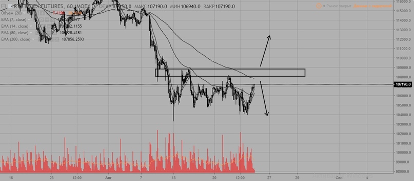 Индекс Московской биржи без изменений, зато РТС показывает слабость. Зарисовано две фигуры продолжения тренда вниз с целями 98000 и 94000 соответственно. Отменой шортовой идеи будет пробитие и закрепление выше уровня 109000.