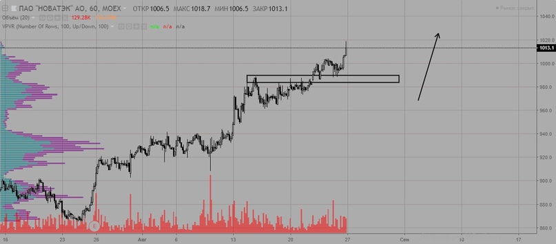 Новатэк достиг цели 1000 по большой фигуре. Дальше ориентиров нет, работаем по локальным уровням. Сейчас приоритет покупок, при пробитии 985 стоит захеджировать позицию. При пробитии 960 отмена приоритета покупок.