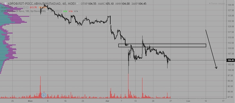 Аэрофлот продолжает сползать вниз. Все задерги поглощаются продажами, это хороший показатель слабости покупателя.