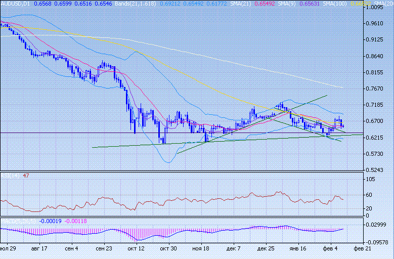 Аусси снизился, поддержку оказали скользящие средние. Пересечение скользящих играет на руку аусси, вероятно аусси удастся удержаться на текущих отметках и подрасти. В случае прорыва вниз аусси упадет к поддержке в районе 0,6330. В сторону роста сопротивление расположено на 0,6760.