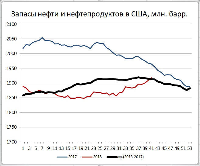Как видим, запасы показали еще одну неделю довольно внушительного роста (хотя не такого резкого, как это обещали в API). В результате произошедшего роста они вплотную приблизились к средним за прошедшие пять лет значениям — базе сравнения для действий ОПЕК. Запасы моторного топлива за неделю подросли на 1 Мб. Стратегические запасы нефти в прошедшую неделю (и это стало важной новостью) за прошедшую неделю снизились сразу на 1,3 Мб (Помним, что в США недавно было принято решение о новой распродаже части стратегических запасов и начать их распродавать перед выборами представляется вполне разумным шагом). Суммарные запасы нефти и нефтепродуктов за неделю выросли на 10,0 мб (до 1918,7 с 1908,7 Мб неделей ранее). И этот показатель, тоже приблизился к средним пятилетним значениям за 2013-2017 годы (более того — даже немного превзошел это среднее значение для соответствующего периода).