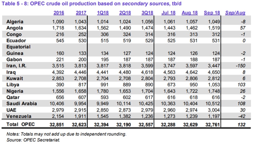 Опубликован октябрьский отчет ОПЕК. Ключевая таблица добычи нефти странами ОПЕК за сентябрь выглядит следующим образом.