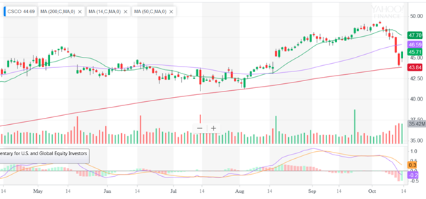 Откат рынка последних недель спровоцировал откат котировок Cisco к 200-дневной скользящей средней, которую цена не смогла преодолеть. Кроме того, зеленая свеча с перекрытием пятницы говорит о локальном развороте. На более длительном горизонте рассмотрения, бумаги продолжают оставаться в среднесрочном повышательном канале и после стабилизации могут возобновить рост с целью $49,97.