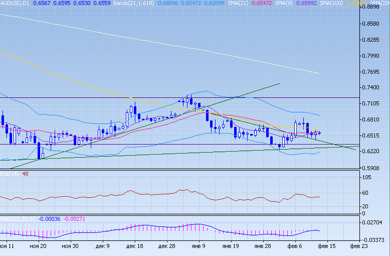 Боковая торговля в середине полосы Боллинжера продолжилась, ситуация нейтральна, поддержку оказывают скользящие средние. Пересечение скользящих усиливает ожидания вползания аусси к верхним отметкам. Сильная поддержка расположена на 0,6330. Сопротивление расположено на 0,6760. Консолидация в широком диапазоне продолжается.