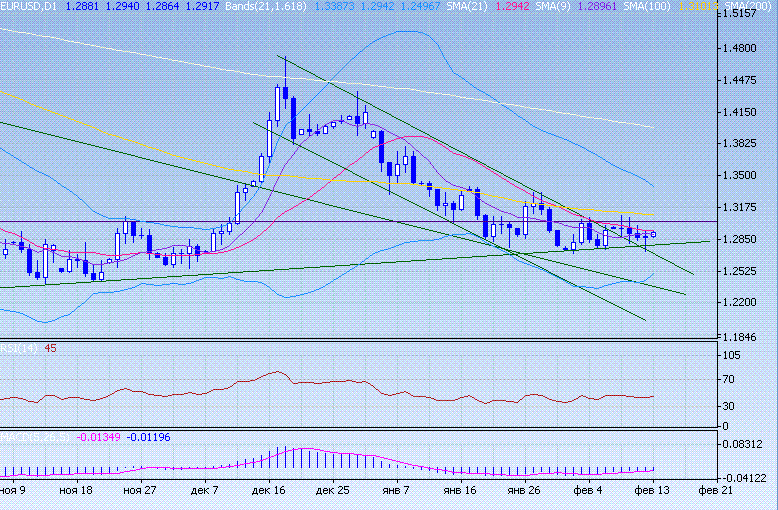 Пара разнонаправлено торговалась в сессию четверга, доллар предпринял неудачную попытку к росту. Поддержку оказала среднесрочная повышательная поддержка (1,2800) и поддержка/сопротивление краткосрочного понижательного канала. Устойчивость позиций евро впоследствии приведет к его росту. Сильное сопротивление проходит по 1,3040, поддержка проходит по 1,2760-40. Выход из канала усиливает ожидания роста евро. Наблюдаем возможное пересечение скользящих средних в сторону роста евро.