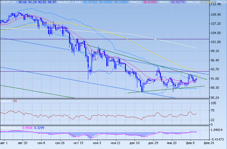 Доллару удалось немного подрасти, торговля смещается в верхнюю половину полосы Боллинжера, усиливая потенциал к росту доллара. Сопротивление при росте будет оказывать слиьное понижательное сопротивление на 91,60 и верхняя граница полосы Боллинжера. Значимую поддержку доллару оказывает 21 МА.