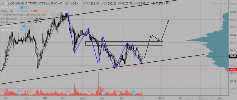 Разберем акции МТС аналогично Сбербанку. Рисуется большой восходящий канал. Среднесрочный приоритет шорт.