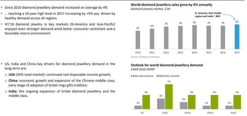 Компания улучшает свой финансовый результат за счет небольшого восстановления спрос на алмазы ювелирного качества и, соответственного продажи более лучшего продуктового микса.