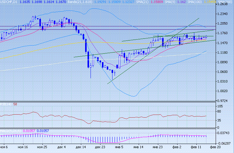 Свисси теряет позиции, сопротивление доллару при росте оказывает отметка 1,1675. Ее прорыв приведет к росту доллара под сопротивление краткосрочного канала (1,1820). Поддержку доллару оказывает 9 МА и 21 МА, далее поддержка канала.