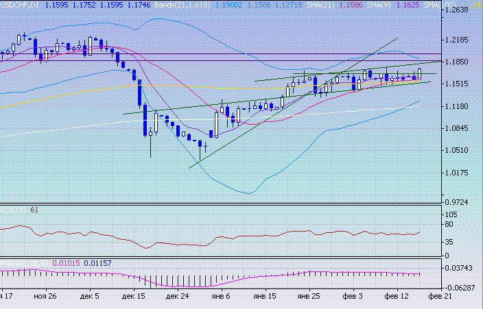 Доллар преодолел промежуточное сопротивление на 1,1675, направляется к сопротивлению повышательного канала в районе 1,1830. Несколько выше сосредоточена серия довольно сильных сопротивлений, сопротивление на 1,1875 и верхняя граница полосы Боллинжера на 1,1905. Поддержку теперь будет оказывать отметка 1,1675