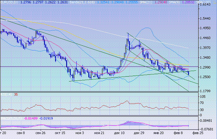 Евро снижался в сессию понедельника. Поддержку оказывает поддержка/сопротивление понижательного канала и нижняя граница полосы Боллинжера. Давление на евро не ослабевает, в то же время прорыв поддержек кажется маловероятным. Вероятно, пара будет консолидироваться какое-то время вблизи текущих отметок. В случае дальнейшего снижения евро упадет к минимумам конца 2008 в районе 1,2320. Сопротивление при росте будет оказывать повышательное сопротивление на 1,2800.