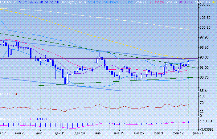 Доллар вырос под сопротивление среднесрочного понижательного канала (92,69) и верхнюю границу полосы Боллинжера. Вероятен краткосрочный рост доллара под сопротивление на 93,10/93,60 после чего ожидаем отката и консолидации. Поддержку доллару будут оказывать отметки в районе 92,10 и понижательная поддержка на 91,32.