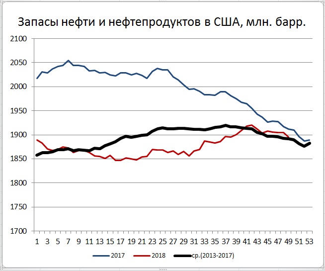 Запасы моторного топлива за неделю выросли на 1,7 Мб. Стратегические запасы нефти за прошедшую неделю вновь снизились, на этот на 1,0 Мб. После «полки», закончившейся в сентябре этот показатель похудел уже на вполне ощутимые для рынка 10,4 Мб. Еще более внушительным выглядит снижение с полки, закончившейся в начале 2017 года. Суммарные запасы нефти и нефтепродуктов за неделю снизились на 9,4 Мб (до 1895,4 с 1904,8 Мб неделей ранее). Этот показатель просто лег на кривую средних пятилетних значений за 2013-2017 годы.