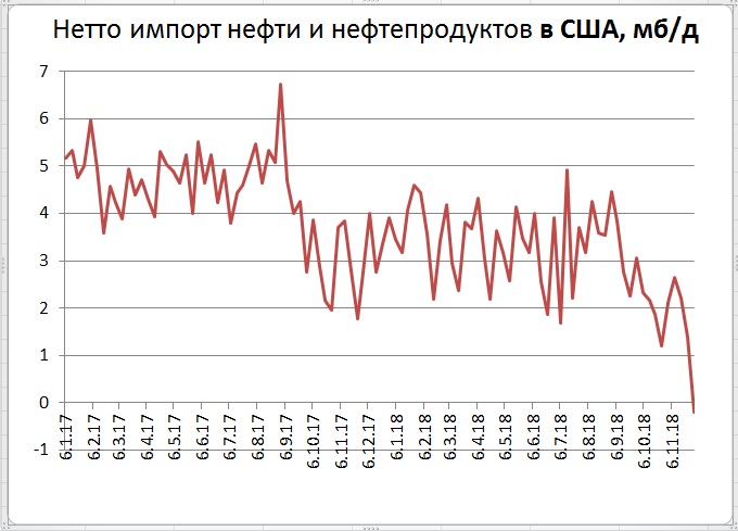 Цены нефти вначале на снижении запасов немного подскочили, но потом, с учетом сильного снижения нетто импорта, продолжили снижение и по WTI вновь опустились ниже 50 долларов за баррель. Превращение США в нетто экспортера это очень сильный сигнал ОПЕК. Судя по динамике цен пока произведенный эффект все же немного теряется на фоне шторма, происходящего на многих рынках (включая фондовые рынки). Выход данных о запасах и добыче дал лишь относительно небольшой вклад в бушевавшем в течение дня море страстей. Напомним, что цены на нефть в четверг днем показывали снижение на 5% после заявлений министра энергетики Саудовской Аравии Халида аль-Фалиха, сделанных в Вене перед встречей ОПЕК. Он заявил, что соглашения по уровню добычи нефти ОПЕК+ в 2019 году пока нет, а есть только различные предложения. И это перед открытием заседания! Такой уровень противоречий и несогласованность повергли рынок в шок, в результате которого два- три часа цены нефти потеряли около 3 долларов за баррель (а от декабрьских максимумов потери составляли около 5 долларов за баррель). Так что поволноваться было о чем. По словам Халида аль-Фалиха, ОПЕК+ обсуждало сокращение добычи на 0,5-1,5 Мб/д. По его мнению, адекватным был бы объемом сокращения 1 Мб/д. Дале паника немного успокоилась и после заявлений, что ОПЕК согласовал снижение добычи, цены нефти отыграли вверх значительную часть понесенных потерь. Правда, официально параметры снижения огласят лишь завтра на совместной конференции в средине дня. (Нельзя исключить, что детали договоренностей от инсайдеров могут просочиться в СМИ немного раньше).