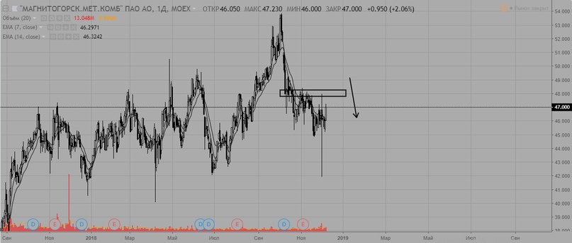 ГМК подтвердил уровень интереса покупателя. Открывать длинные позиции можно от уровня 12500-12600. Пробой уровня даст сигнал на локальный разворот и цена, с большой вероятностью, пойдет на ретест 12000.