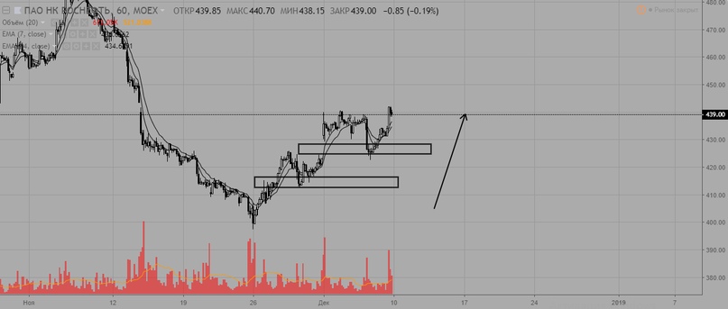 Роснефть зарисовала новый локальный уровень интереса покупателя — 425. Пока цена выше этого уровня, отдаем предпочтение покупкам.