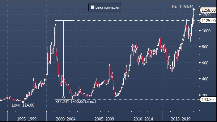 Первый исторический пик драгоценный металл сформировал в январе 2001 года, поднявшись до $1 125 доллара за унцию. Затем последовало падение на 87%: в апреле 2003 цена на палладий достигла дна на уровне $143.50.