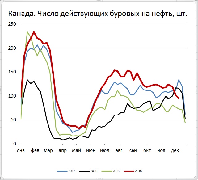 В Канаде снижение в абсолютных числах более существенное (а в процентах — вообще продолжающийся провал). Кроме снизившейся цены на канадских буровиков, начинает действовать приближение Рождества. Там традиционно буровые работы подвержены сильным сезонным колебаниям. Особенно сильный провал наблюдается как раз в новогодние праздники.