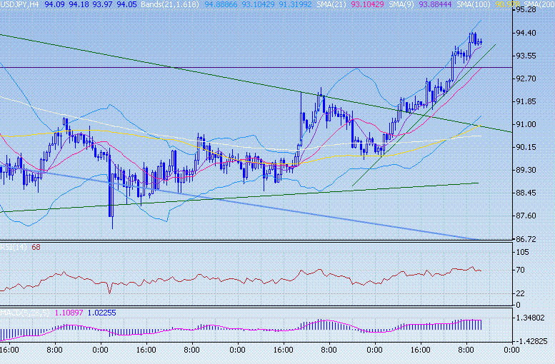 Доллар вырос к 94,50, затем откатился к нижним отметкам. Йену поддерживают японские экспортеры. Тем не менее, значительного снижения доллара не последовало, а восходящий тренд ускорился. Вероятен откат к отметкам в районе 93,10, затем последует рост.